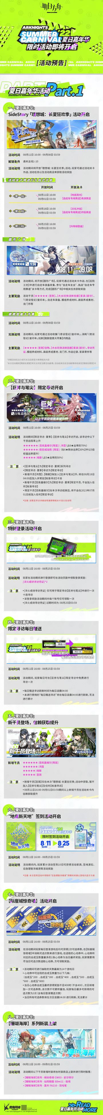 { "text": "2022「夏日嘉年华」限时活动即将开启\n\n◆ 夏日嘉年华活动Part.1\n一、「夏日嘉年华」,SideStory「理想城:长夏狂欢季」活动开启\n二、「夏日嘉年华」,【巨斧与笔尖】限定寻访开启\n三、「夏日嘉年华」,特别登录活动开启\n四、「夏日嘉年华」,限定寻访每日赠送\n五、「夏日嘉年华」新干员登场,信赖获取提升\n六、「夏日嘉年华」,“地底新天地”签到活动开启\n七、「夏日嘉年华」,【际崖城惊奇墙】活动开启\n八、「夏日嘉年华」,【珊瑚海岸】系列新装上架\n九、「夏日嘉年华」,【珊瑚海岸】系列时装复刻上架Part.1\n十、「夏日嘉年华」,【珊瑚海岸】系列时装复刻上架Part.2\n十一、「夏日嘉年华」,【珊瑚海岸】系列时装复刻上架Part.3\n十二、「夏日嘉年华」,【罗德岛风尚回顾】限时开启\n十三、「夏日嘉年华」,【大水坑快活体验屋】家具限时获取\n十四、「夏日嘉年华」,夏日组合包限时上架\n十五、「夏日嘉年华」,芯片礼包限时上架\n十六、「夏日嘉年华」,【公开招募】干员更新\n十七、新增【糖果仙子的宴会厅】主题家具,关卡幸运掉落更替\n\n◆ 夏日嘉年华活动Part.2\n一、「夏日嘉年华」,#01「引航者试炼」限时活动开启\n\n◆ 夏日嘉年华活动Part.3\n一、「夏日嘉年华」,#10赛季「尘环行动」开启\n二、「夏日嘉年华」,【联合行动】特选干员定向寻访开启\n三、「夏日嘉年华」,“资源收集”限时全天开放\n\n更多活动内容请持续关注《明日方舟》游戏内公告及官方公告。", "raw_text": "" }