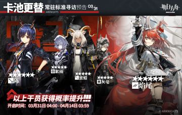 { "text": "【常驻标准寻访预告】\n起止时间:03月31日04:00 ~ 04月14日03:59\n寻访说明:常驻标准寻访更新,该寻访中以下干员获得概率提升;\n★★★★★★:焰尾 / 陈(占6★出率的50%)\n★★★★★:絮雨 / 蜜蜡/ 灰毫(占5★出率的50%)\n\n更多后续活动内容及最新消息请关注《明日方舟》游戏内公告、官网及双微,感谢大家的支持", "raw_text": "" }