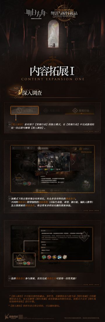 { "text": "集成战略 「傀影与猩红孤钻」 内容拓展 · 一\n//深入调查\n\n◆ 【深入调查】是有别于【常规行动】的独立模式,在【常规行动】中完成游戏结局一次后即可解锁【深入调查】。\n◆ 【深入调查】模式下的古堡环境会有所变化,有众多各有特色的调查条目。\n◆ 选择调查条目参与探索,首次完成调查任务可获得一次性奖励。\n◆ 【深入调查】中可能出现的收藏品、事件等,其解锁状态与您当前【猩红收藏】中的解锁状态无关,也无法解锁【猩红收藏】或更新藏品的拥有状态。该模式不会对【猩红孤钻蚀刻章套组】进行计数。\n◆ 【深入调查】的所有条目将会常驻,可以随时游玩。\n\n_________________\n更多「傀影与猩红孤钻」集成战略主题内容,请持续关注《明日方舟》官方自媒体账号。", "raw_text": "" }