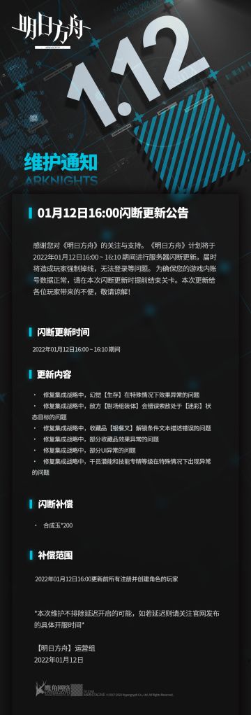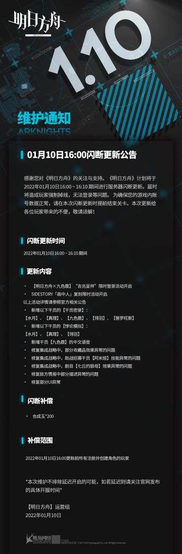 "text": "01月10日16:00闪断更新公告 ",