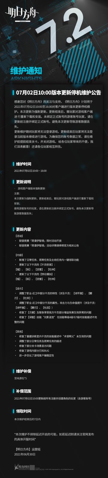 { "text": "06月18日16:00闪断更新公告\n\n感谢您对《明日方舟》的关注与支持。《明日方舟》计划将于2021年06月18日16:00 ~ 16:10 期间进行服务器闪断更新。届时将造成玩家强制掉线,无法登录等问题。 为确保您的游戏内帐号数据正常,请在本次闪断更新时提前结束关卡。本次更新给各位玩家带来的不便,敬请谅解!\n\n闪断更新时间:\n2021年06月18日16:00 ~ 16:10 期间\n\n更新内容:\n◆修复了部分UI错误的问题\n\n闪断补偿:合成玉*200\n补偿范围:2021年06月18日16:00更新前所有注册并创建角色的玩家(含游客账号)\n\n*本次维护不排除延迟开启的可能,如若延迟则请关注官方发布的具体开服时间*", "raw_text": "" }