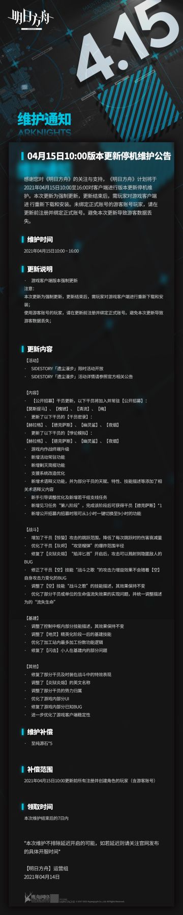 { "text": "#明日方舟# 04月15日10:00版本更新停机维护公告\n\n感谢您对《明日方舟》的关注与支持,《明日方舟》计划将于2021年04月15日10:00至16:00对客户端进行版本更新停机维护。本次更新为强制更新,更新结束后,需玩家对游戏客户端进 行重新下载和安装。未绑定正式账号的游客账号玩家,请在更新前注册并绑定正式账号。避免本次更新导致游客数据丢失。\n\n更新维护期间玩家将无法登录游戏,更新结束后玩家将无法登录当前版本继续进行游戏。为确保您的账号数据正常,请在维护前提前结束关卡,并关闭游戏。 给各位玩家带来的不便,我们深表歉意!还请各位玩家相互转告。\n\n维护时间:\n2021年04月15日10:00 ~ 16:00\n\n更新说明:\n◆游戏客户端版本强制更新\n注意:\n本次更新为强制更新,更新结束后,需玩家对游戏客户端进行重新下载和安装;\n使用游客账号的玩家,请在更新前注册并绑定正式账号。避免本次更新导致游客数据丢失;\n\n更新内容详见图内\n\n强制更新补偿:至纯源石*5\n补偿范围:2021年04月15日10:00更新前所有注册并创建角色的玩家(含游客账号)\n领取时间:本次维护结束后的7日内\n\n*本次维护不排除延迟开启的可能,如若延迟则请关注官方发布的具体开服时间* ", "raw_text": "" }