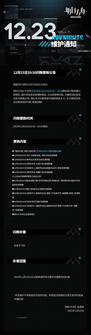 [明日方舟]12月23日20:30闪断更新公告 感谢您对《明日方舟》的关注与支持。《明日方舟》计划将于2025年12月23日20:30 ~ 20:40期间进行服务器闪断更新。届时将造成玩家强制掉线,无法登录等问题。为确保您的游戏内账号数据正常,请在本次闪断更新时提前结束关卡。本次更新给各位玩家带来的不便,敬请谅解! 闪断更新时间: 2025年12月23日20:30 ~ 20:40 期间 更新内容