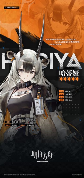【采购凭证区-新增干员】 //哈蒂娅 “博士你好,我是哈蒂娅,萨尔贡的剑角部族的后裔,为了完成荒野给我的挑战,前来罗德岛进行学习。” __________________ 一场特殊演练的结果已见分晓。 哈蒂娅带领的哥伦比亚队和暴雨为首的萨尔贡队进行了多场荒野环境模拟战斗演练。演练进行了多个回合,哈蒂娅坚持以哥伦比亚科技为主导的战法与萨尔贡队交手,但除了一场低能见度环境的对抗之外,哥伦比亚队均败给了