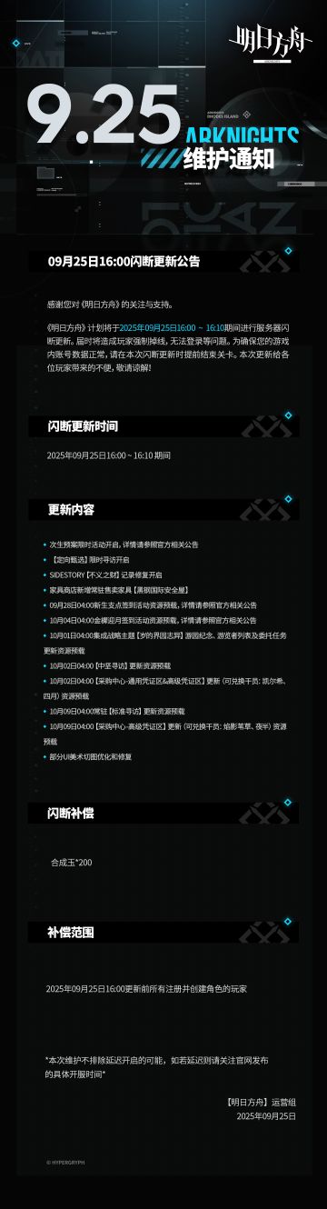 [明日方舟]09月25日16:00闪断更新公告