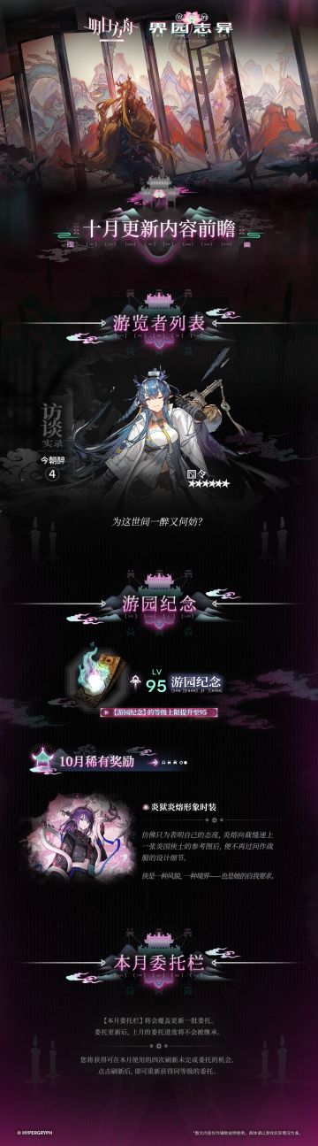 集成战略「岁的界园志异」 十月更新内容前瞻 ◆ 【游览者列表】 本月【游览者列表】: 令 ◆ 【游园纪念】 【游园纪念】的等级上限提升至95。 本月稀有奖励: 炎狱炎熔形象时装 ◆ 【本月委托栏】 【本月委托栏】将会覆盖更新一批委托。委托更新后,上月的委托进度将不会被继承。 您将获得可在本月使用的四次刷新未完成委托的机会。点击刷新后,即可重新获得同等级的委托。 _________________ 更