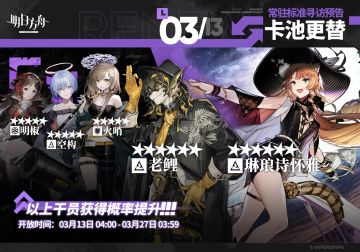 【常驻标准寻访】 起止时间:3月13日04:00 ~ 3月27日03:59 寻访说明:常驻标准寻访更新,该寻访中以下干员获得概率提升; ★★★★★★:琳琅诗怀雅 / 老鲤(占6★出率的50%) ★★★★★:明椒 / 空构 / 火哨(占5★出率的50%) *本次寻访期间,以下干员可于凭证交易所内使用高级凭证兑换:老鲤、空构 更多后续活动内容及最新消息请关注《明日方舟》游戏内公告、官网及双微,感谢大家