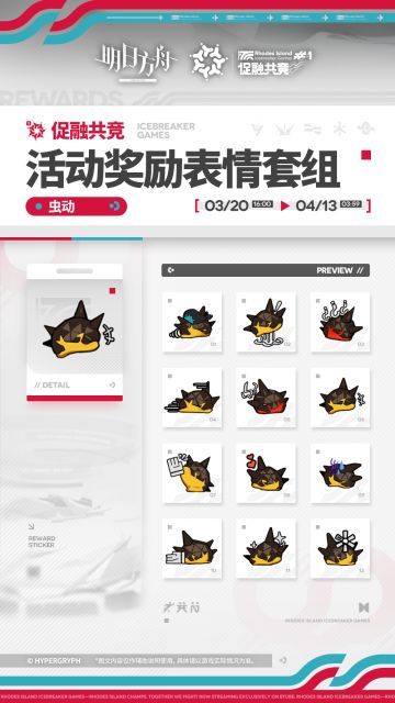 【活动奖励表情套组】 //虫动 “不要再扯着嘴角摆出这个僵硬的微笑了,试着像源石虫那样,敞开甲壳,舒展软体组织......相信我,只要这么做,你们很快就不会再尴尬了。” _____________ 活动奖励【表情套组:虫动】,促融共竞#1限时活动提升 【赛事热度】等级获取 活动开放时间:3月20日 16:00 - 4月13日 03:59