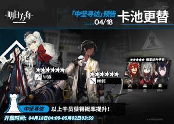 【中坚寻访】 起止时间:4月18日04:00 ~ 5月2日03:59 寻访说明:该寻访中以下干员获得概率提升; ★★★★★★:早露 / 棘刺(占6★出率的50%) ★★★★★:慑砂 / 红 / 月禾(占5★出率的50%) 更多后续活动内容及最新消息请关注《明日方舟》游戏内公告、官网及官方自媒体账号,感谢大家的支持