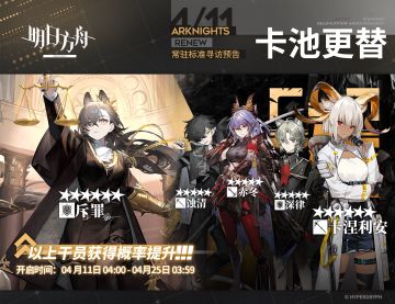 【常驻标准寻访】 起止时间:4月11日04:00 ~ 4月25日03:59 寻访说明:常驻标准寻访更新,该寻访中以下干员获得概率提升; ★★★★★★:斥罪 / 卡涅利安(占6★出率的50%) ★★★★★:蚀清 / 赤冬 / 深律(占5★出率的50%) 更多后续活动内容及最新消息请关注《明日方舟》游戏内公告、官网及双微,感谢大家的支持