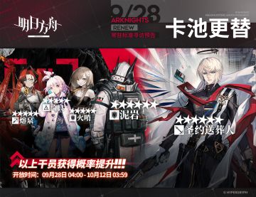 【常驻标准寻访】 起止时间:9月28日04:00 ~ 10月12日03:59 寻访说明:常驻标准寻访更新,该寻访中以下干员获得概率提升; ★★★★★★:圣约送葬人 / 泥岩(占6★出率的50%) ★★★★★:熔泉 / 绮良 / 火哨(占5★出率的50%) 更多后续活动内容及最新消息请关注《明日方舟》游戏内公告、官网及双微,感谢大家的支持
