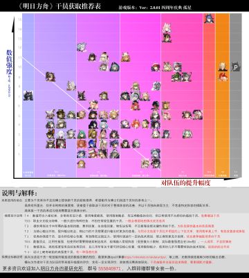 重置版本已经发布,请转移至新帖: https://www.taptap.cn/moment/422796624033483457 —————————————————— 最近讨论抽卡的博士比较多,于是做了一张干员获取的推荐表出来。 图中画了一条斜线,此线右侧距离越远的干员,对队伍强度提升越显著,向左侧则反之。 由于舟游干员搭配的复杂性和灵活性,只有两个轴的坐标系肯定还是略显粗糙的,希望能作为新人博士