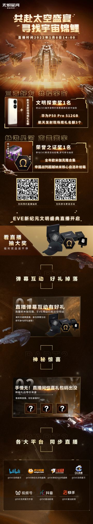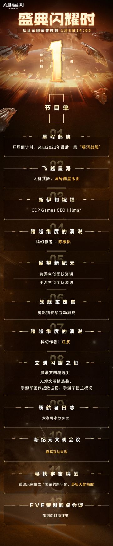 "text": "【新纪元文明盛典】倒计时1天!直播节目单揭晓!\n\n直播将在1月8日14:00开启!盛典闪耀,你我共同见证!\n飞行员们不仅能倾听科幻作家“跨维度演说”和飞行员的分享会,更有互动游戏和策划面对面的惊喜环节!宇宙锦鲤终极大奖等你来拿!\n飞行员们记得预约直播,准时观看哦!更多节目详情快戳长图查看吧~",