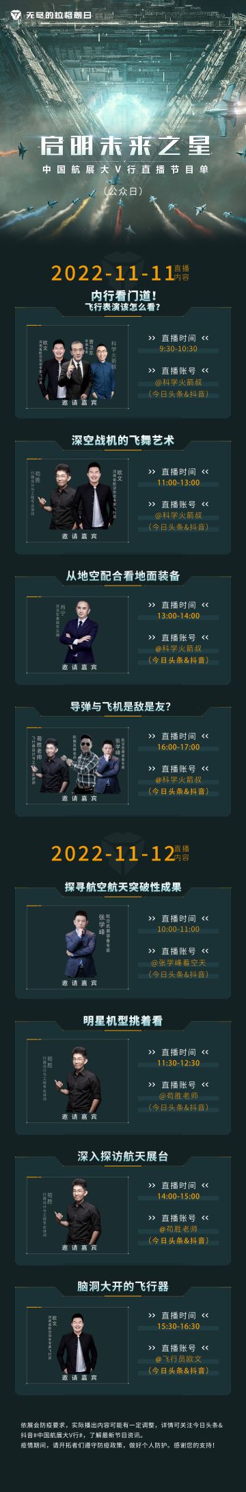 { "text": "#启明未来之星# #无尽的拉格朗日带你直击珠海航展#\n\n第十四届珠海航展公众日已于今日正式开始!\n经历了专业日的直播讲解,想必各位开拓者已经对本届航展有了初步的了解,而随之到来的公众日,则将有更多的观众参与到这场盛会中来。\n在此期间,《无尽的拉格朗日》同样邀请了多名业内知名人士担任评说员,为各位开拓者讲解航展内容,详细信息可点击下列图片查看。\n更多珠海航展相关情报,也欢迎锁定本频道, 我们将为各位开拓者带来更多精彩内容。\n\n*请注意,应展会要求,实际直播内容可能存在一定调整,具体播出内容请以直播为准\n\n\n——拉格朗日频道独家报道", "raw_text": "" }