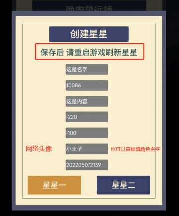 { "text": "公告:更新,自定义网络头像!自定义时间!\n看到大家想要自选头像,想要设置时间,嗯……\n小白本来关闭了电脑,准备回家好好睡觉了的!\n但是,为了让一测有个更好的体验!!!\n他又回去工作室了!继续完善,这是一测最后一次更新!!!\n\n我们说过,晚安森林的核心体验是:陪伴!\n\n每个人有两颗星星,除了添加自己的,还可以相互陪伴的!!!\n\n期待下次与你相遇,美梦太空的星星永远陪伴你!\n\nPS:如果你不知道怎么使用网络头像的话,那么,可以输入你喜欢的角色名字。\n目前有一测有以下角色:\n阿狐\n猫酱\n柴柴\n酷鹅\n岱哥\n黑米\n北北\n夏洛\n柯柯\n龙哥\n尤尼\n鹿易\n皮皮\n松子\n兔灵\n小王子\n艾莉奶奶\n薇薇安\n利伟\nX-1024\n犀牛大哥\n小白\n鸡哥\n\n请查看引导图。\n\n\n网络头像可以在网页图片右击\n复制图片地址。", "raw_text": "" }