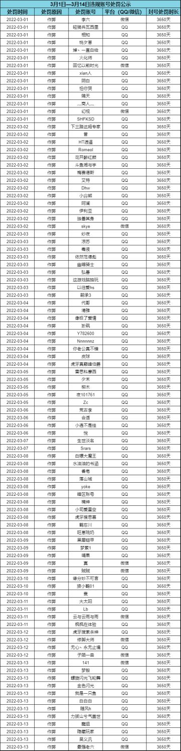 外挂行为零容忍,处罚名单公示(3月14日)