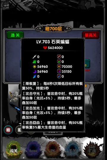 { "text": "卡关是不可能卡关的!\n大型闯关解题思路贴\n\n暗661~840层(如图700层720层780层,降恢复和盾之反伤,技能重点讲解)\nPS:\n(1),注意如下技能概率和比例根据款卡关卡会有提升。\n(2),装备硬件需要逐步提升。橙色装备逐渐退出舞台,要换上红色装备。\n(3),铁匠铺,将装备洗练核心属性到5格,强化到满星,属性对的装备升品到红色。\n(4),宝石拿到了就立马带上,因为随时可以卸下替换\n(5),追加量力而行,魔纹建议放在毕业装备上\n(6),宠物可以先喂养到开启天赋,为英雄如虎添翼\n1,攻击守暗:普攻命中时,有20%概率自身(暗抗+5%),持续5秒,最多叠加50层\n2,攻击加暗:普攻命中时,有20%概率自身(暗攻+5%),持续5秒,最多叠加50层\n3,攻击守物:普攻命中时,有20%概率自身(物抗+5%),持续5秒,最多叠加50层\n4,攻击加物:普攻命中时,有20%概率自身(物攻+5%),持续5秒,最多叠加50层\n5,攻击守毒:普攻命中时,有20%概率自身(毒抗+5%),持续5秒,最多叠加50层\n6,攻击加毒:普攻命中时,有20%概率自身(毒攻+5%),持续5秒,最多叠加50层\n7,攻击守光:普攻命中时,有20%概率自身(光抗+5%),持续5秒,最多叠加50层\n8,攻击加光:普攻命中时,有20%概率自身(光攻+5%),持续5秒,最多叠加50层\n9,攻击守电:普攻命中时,有20%概率自身(电抗+5%),持续5秒,最多叠加50层\n10,攻击加电:普攻命中时,有20%概率自身(电攻+5%),持续5秒,最多叠加50层\n11,攻击守抗:普攻命中时,有20%概率自身(所有抗性+5%),持续5秒,最多叠加50层\n12,攻击加攻:普攻命中时,有20%概率自身(所有攻击+5%),持续5秒,最多叠加50层\n13,降恢复:每8秒1次降低目标所有恢复50%,持续5秒\n14,盾之反伤:获得护盾时,(反伤+40%),持续5秒,最多叠加5层\n\n1~12 攻击守/加“属性”\n解题思路\n用前边的战士强撸也是可以的。\n如果需要针对的话,如下图缴械法师为优秀的解法。(天赋见附件图)\n所以,法师优先。\n\n13,降恢复:每8秒1次降低目标所有恢复50%,持续5秒\n解题思路\n降低恢复对于战士回血会有影响,\n所以,法师优先。\n\n14,盾之反伤:获得护盾时,(反伤+40%),持续5秒,最多叠加5层\n解题思路\n直接一层就有40%的反伤,两层80%反伤。着实让战士头疼。\n法师多为技能伤害,技能受到的反伤比例比普通攻击要低很多。\n所以,法师优先。\n\n\n暗661~840层 推荐职业:法师 (天赋见附件图)\n法师前期(进阶)装备搭配推荐\n首先建议入手1枚魔纹:无相纹。必备。打在爆发头饰上。可以满足两个套装的效果。\n主手:蝴蝶套装(WILL的大保健)\n副手:蝴蝶套装(蝴蝶套装毕业)\n项链:冷却套装(冷却项链毕业)\n戒指:蝴蝶套装(蝴蝶套装毕业)\n头部:冷却套装(爆发头饰)\n胸部:蝴蝶套装(蝴蝶套装毕业)\n手套:蝴蝶套装(蝴蝶套装毕业)\n鞋子:蝴蝶套装(狰狞战靴或神话装备)", "raw_text": "" }