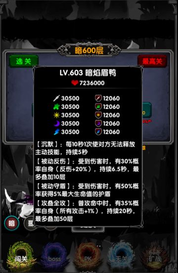 "text": "卡关是不可能卡关的!\n大型闯关解题思路贴\n\n暗600层\n1,沉默:每10秒1次使对方无法释放主动技能,持续5秒\n2,被动反伤:受到伤害时,有30%概率自身(反伤+20%),持续6.5秒,最多叠加10层\n3,被动守盾:受到伤害时,有50%概率获得5%最大生命值的护盾\n4,攻叠全攻:普攻命中时,有35%概率自身(所有攻击+1%),持续20秒,最多叠加50层\n\n\n解题思路:(装备碾压者勿扰)\n1,沉默:每10秒1次使对方无法释放主动技能,持续5秒\n解题思路:\n简单理解为每10秒沉默5秒,那么法系将会很难受。\n所以战士,猎人会优先考虑。\n\n2,被动反伤:受到伤害时,有30%概率自身(反伤+20%),持续6.5秒,最多叠加10层\n解题思路:\n攻击速度越快,怪物叠得越快,10层后200%反伤。建议,在怪物叠起来之前秒掉他。\n所以,战士优先。\n\n3,被动守盾:受到伤害时,有50%概率获得5%最大生命值的护盾\n解题思路:\n这个技能像不像装备“不知足的血牛甲”的护盾版?建议,攻速不宜太快,2下秒掉他。\n所以,战士优先。\n\n4,攻叠全攻:普攻命中时,有35%概率自身(所有攻击+1%),持续20秒,最多叠加50层\n解题思路:\n闯关时间尽量减少。\n职业无差别。\n\n暗600层:\n战士前期(进阶)装备搭配\n答:首先建议入手1枚魔纹:自残纹。必备。打在双重蛇刃上。可以稳定触发受到伤害时这个条件。\n(可选1枚无相纹,打在鞋子-就是矫情的快艇上,)\n(可选1枚套装纹,打在新手头盔上,)\n主手:攻速套装(达子之枪)\n副手:攻速套装(双重蛇刃)\n项链:攻速套装(狂暴套装)\n戒指:狂暴套装(爆炸星戒)\n头部:精准套装(强韧之首)\n胸部:精准套装(不知足的血牛甲)\n手套:狂暴套装(狂暴套装毕业)\n鞋子:狂暴套装(狂暴套装毕业)",