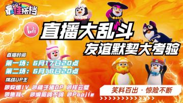 "text": "UP主直播大乱斗 友谊默契大考验\n各位惨遭猪队友陷害落水的搭档,看热闹的时候到啦~!\n😈😈小企鹅邀请了B站UP主@安娜iv,@橘子猪OP,@祥云璧,@焦耳、,@编哥鸽不鸽,@Popjie 前来接受小企鹅的默契大考验~!\n😍😍我们会把6位UP主关在一个房间内进行组队大乱斗。哪一组能从这次恶趣味不断,笑料百出的乱斗中突围而出夺得“perfect partner”的头衔呢?小企鹅诚邀各位搭档前来见证!\n\n😉直播平台:哔哩哔哩\n\n😉直播时间:\n场次1:6月17日20:00 场次2:6月18日20:00\n\n小企鹅听闻在直播期间,各位up主准备了游戏key送给观众噢,大家不要错过啦,我们直播见!",