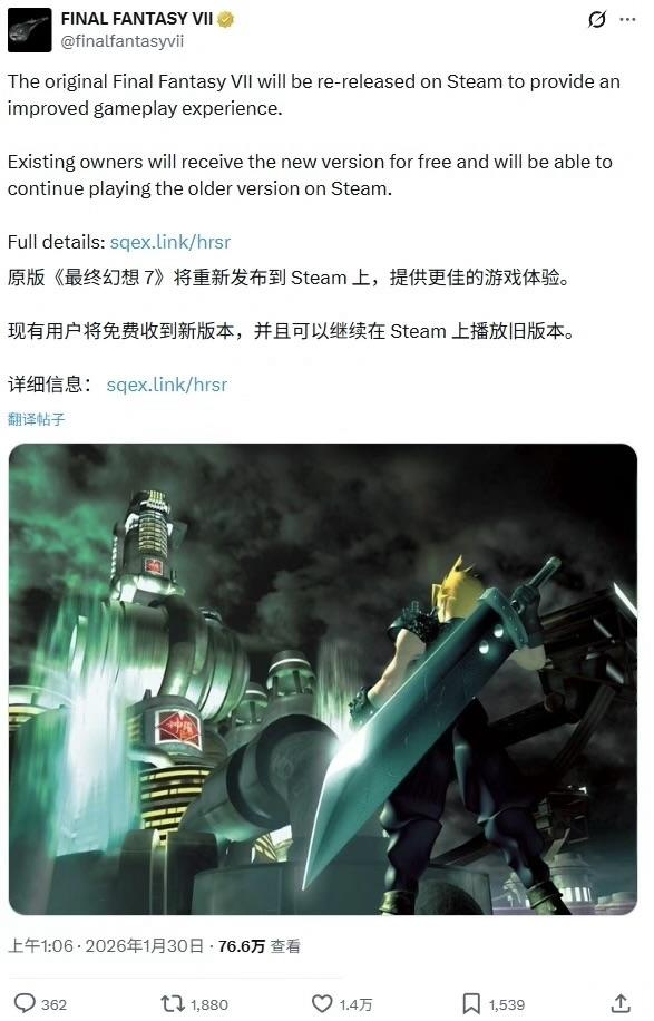 经典归来 SE官宣原版《最终幻想7》Steam平台重新发行