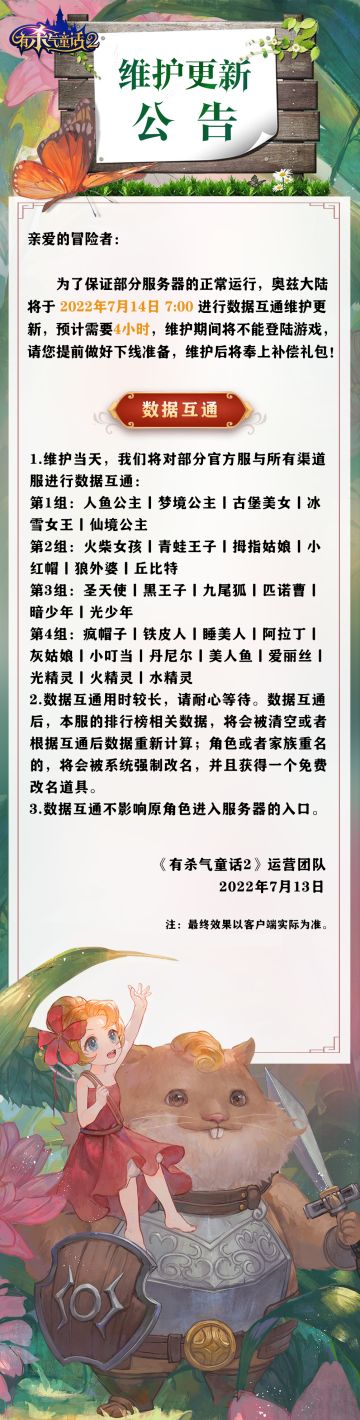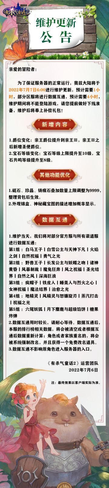"text": "为了冒险者们在童话王国尽情遨游,奥兹大陆将于明日进行维护更新,新增爵位与宝石等级变化!部分服务器将数据互通~",