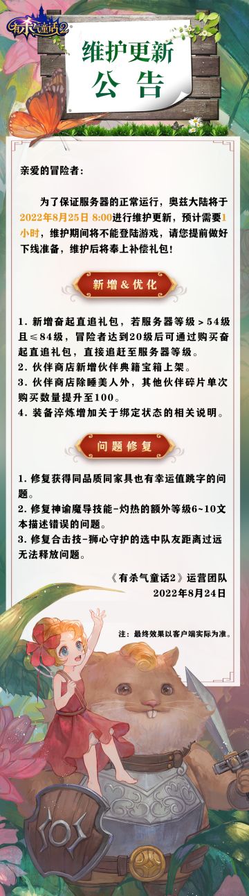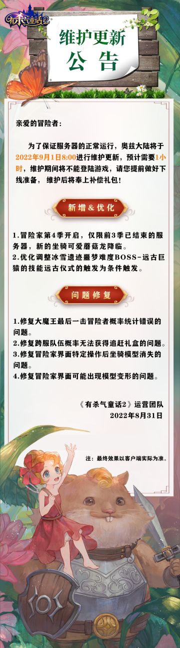 "text": " 为了保证服务器的正常运行,奥兹大陆将于2022年9月1日8:00进行维护更新,预计需要1小时,维护期间将不能登陆游戏,请您提前做好下线准备。\n维护后将奉上补偿礼包!\n本次维护针对大家关心的问题,说明如下:\n【新增&优化】\n1.冒险家第4季开启,仅限前3季已结束的服务器,新的坐骑可爱蘑菇龙降临。\n2.优化调整冰雪遗迹噩梦难度BOSS-远古巨猿的技能远古仪式的触发为条件触发。\n\n【问题修复】\n1.修复大魔王最后一击冒险者概率统计错误的问题。\n2.修复跨服队伍概率无法获得追赶礼盒的问题。\n3.修复冒险家界面特定操作后坐骑模型消失的问题。\n4.修复冒险家界面可能出现模型变形的问题。\n\n\n《有杀气童话2》运营团队\n2022年8月31日",