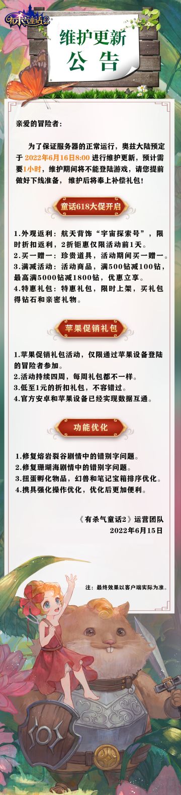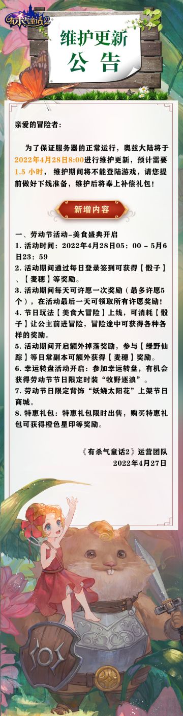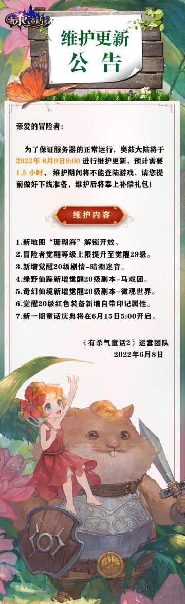 "text": "小红帽送来最新维护公告!更强大的黑魔法军团即将降临奥兹,等你来挑战✊",
