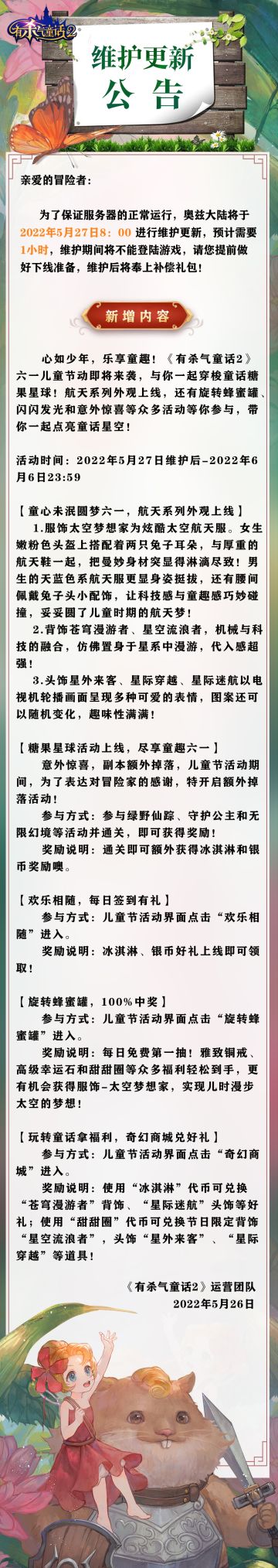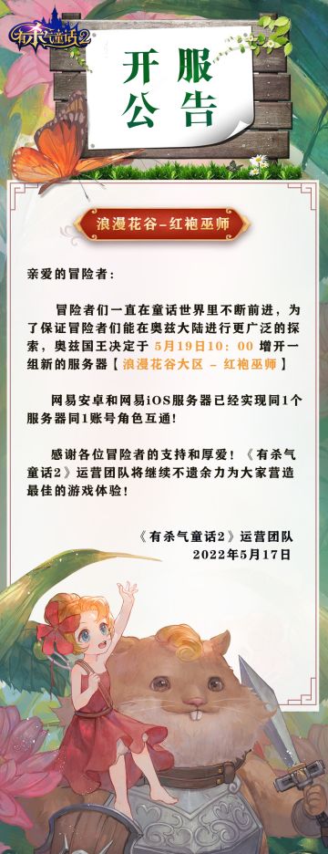 "text": "开服公告来啦!5月19日小红帽在浪漫花谷大区-红袍巫师等各位噢~",