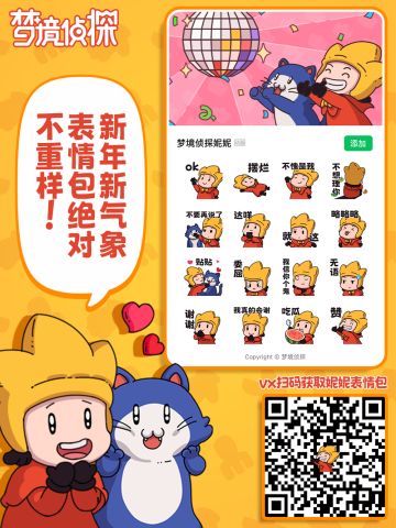 Hi,各位大侦探们久等啦!梦境侦探妮妮表情包已上架,快来下载吧! 下载方式:保存下方图片,在微信平台中扫码添加即可~