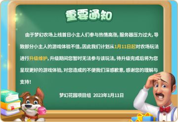 { "text": "各位小主人:\n 由于梦幻农场上线首日小主人们参与热情高涨,服务器压力过大,导致部分小主人的游戏体验不佳。因此我们计划从1月11日起对农场玩法进行升级维护,升级期间您暂时无法参与该玩法,待升级完成后将为您呈现更好的游戏体验,对您造成的不便我们深感歉意,感谢您的理解与支持!\n \n梦幻花园项目组 2023年1月11日", "raw_text": "" }