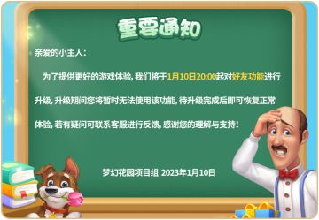 { "text": "亲爱的小主人:\n 为了提供更好的游戏体验,我们将于1月10日20:00起对好友功能进行升级,升级期间您将暂时无法使用该功能,待升级完成后即可恢复正常体验,若有疑问可联系客服进行反馈,感谢您的理解与支持!\n \n梦幻花园项目组 2023年1月10日", "raw_text": "" }