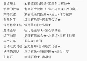 { "text": "第一章\n1秉持优雅:放着红茶的圆桌+麦田+魔力之泉\n2彩虹石:幸运石像+水银灯\n3灯下幽影:黑曜石兄弟会+水银灯+宝石收纳箱\n4丰产之车:风车+麦田\n5魔法竖琴;祖母绿竖琴+宝石收纳箱\n6燃烧的梦魇:红宝石马厩+魔力之泉+翡翠剑士营地\n7妖精的嬉戏:妖精花圃+幸运石像+炼金小屋\n8银月炼金工房:炼金小屋+银月草\n9圆桌骑士:翡翠剑士营地+放着红茶的圆桌\n10紫晶射手:蓝宝石公馆+红宝石马厩\n第二章\n1魔像工坊+晶矿采集场=魔晶工厂\n2魔像工坊+生命祭坛+火之种=生命澎湃的魔像\n3坍塌晶矿+土之种=荒芜\n4晶矿采集场+气之种=风之灵动\n5晶矿采集场+土之种=大地\n6晶矿采集场+水之种=流水之歌\n7晶矿采集场+火之种=火之高兴\n8水晶集薪+生命祭坛=勘探水晶\n9破败的器灵+气之种+魔力之泉=魔力充沛的器灵\n10破败的器灵+希望之塔+生命祭坛=希望之塔的守望\n11魔力之泉+水之种=月之泉\n配图第一章无尽马子帝国无敌", "raw_text": "" }