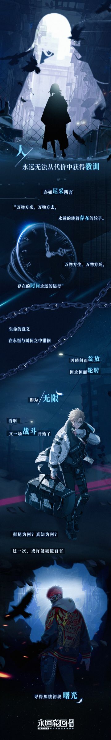 { "text": "“逆转轮回、碎镜逐光” ———《永恒轮回:无限》手游悬念曝光 !\n\n时钟转动的意义是什么\n滴答...滴答...\n而你,又想要时钟怎么旋转呢\n\n稻草不会把握在哀叹者的手上\n黑暗绝望从来不是沉沦的借口\n\n如果是你\n还能找到那根微光的落羽吗...", "raw_text": "" }