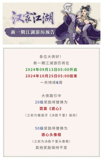 【汉家江湖】第二十三期江湖游历上线时间调整公告