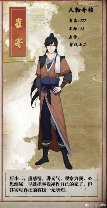 { "text": "各位大侠早上好!感谢光临我们【梅隐客栈】~\n今天隆重向各位介绍我们梅隐客栈的店小二、也就是本游戏《江湖见微簿》的主角——【崔寄】!\n作为店小二的他,性格开朗外向,礼貌热情又周到,是迎来送往、招待客人的一把好手~\n崔寄自小就在客栈中长大,早已把客栈众人视作家人了哦~\n\n正因如此,当他的好兄弟【阿灯】深陷危机之时,他才会义不容辞地挺身而出,救兄弟于水火之中!\n不过,阿灯真的犯罪了吗……?\n\n崔寄:阿灯那么老实,怎么可能犯罪呢!!阿灯一定是冤枉的!QAQ\n", "raw_text": "" }