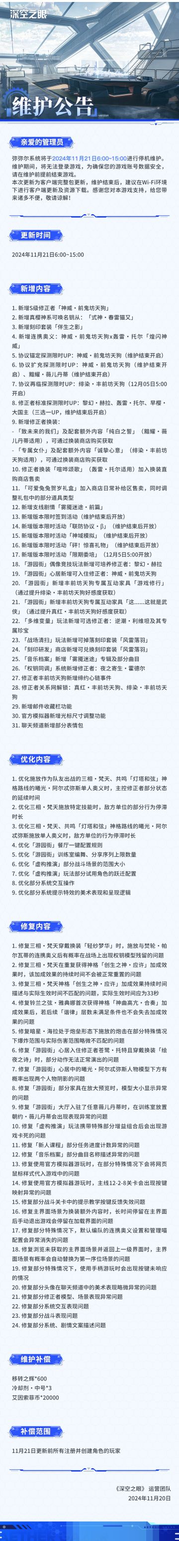 《深空之眼》11月21日停机维护公告
