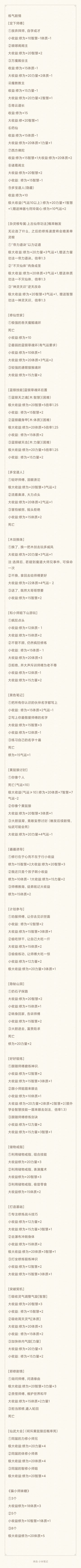 { "text": "【绯絮】事件攻略大全(8.26更)\n\n以下为《混搭修仙》事件攻略大全,以后会努力更新维护事件攻略,更新时间随缘,图片可以放大。\n\n【6.18】由沉舟的前事件攻略大全改编而来,修复127处错误以及老版本问题。\n\n【6.23】修改了8处错误,增加了9个新事件攻略,放在第七页。(感谢七玖,D4,离离,勇士凯利瑞的支持)\n\n【6.29】修改3处错误,新增3个新事件攻略。(感谢猫猫女儿和独断万古金蝉子的支持!)\n\n【7.1】修改2处错误,完善了言出法随事件,新增天狐线5个事件,事件重新归类,图1-6为练气-渡劫事件,图7为天狐线专属事件,图8为大师姐线专属事件,至此《混搭修仙》事件已全齐!!(感谢七玖,小花女儿的支持!)\n\n【7.17】修改3处被暗改选项,新增6个新事件攻略放在图9,事件尚未完善。\n\n【8.26】由林宇落叶道友提供3处新事件更新。\n\n另推广《混搭修仙》鬼市交易&闲聊群:909919366。(目前这个游戏最多人聊天的群)", "raw_text": "" }