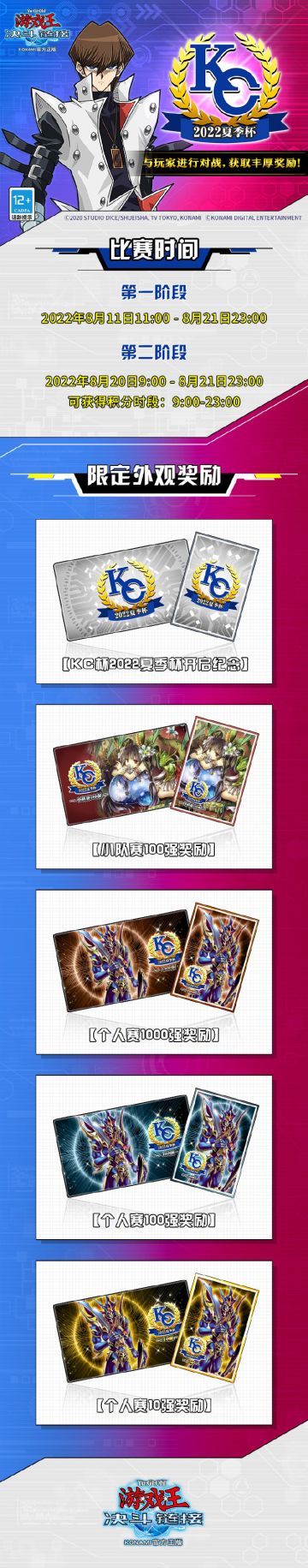 { "text": "【KC杯】2022年夏季杯将于8月11日开幕!\n\n海马娱乐集团杯(KAIBA CORPORATION CUP),简称KC杯。是所有《游戏王:决斗链接》玩家期待的盛大比赛,2022年度夏季杯将于8月11日盛大开幕!\nKC杯将在春季、夏季、秋冬分3次举行,在KC杯中脱颖而出的玩家和小队,将获得线下年度总决赛的参赛资格。\n\n【比赛时间】\n·第1阶段:2022年8月11日-8月21日。\n·第2阶段:2022年8月20日-8月21日。每天9:00-23:00才可获得积分。\n\n【参赛要求】\n·第1阶段:所有玩家均可参加。活动开始时决斗者等级会基于7月赛季中排名决斗的排名而定。\n·第2阶段:第1阶段中决斗者等级达到20或在7月排名决斗赛季中达到决斗王段位的玩家才可参加。第2阶段开始后,未满足参加第2阶段条件的玩家仍可以继续参与第1阶段获取资格。\n\n【小队赛规则】\n在每届KC杯季度赛第2阶段开始前,玩家需要自行与其他玩家组成5人小队,参加该届KC杯小队赛。\nKC杯2022年夏季杯小队赛以小队内积分排名前3名的积分之总和进行小队排行榜积分结算。\n※获得KC杯2022春季杯小队赛排名第一的5名玩家将无法参加本次夏季杯小队赛,在本次KC杯结束后奖励结算时正常发放小队赛前100名奖励。\n\n【线下年度总决赛】\n本届KC杯第2阶段个人积分排名前2名的玩家,以及小队积分第1的小队全体成员,将获得参加线下年度总决赛的资格。\n※具体结算方式及名额产生与替补方式,请以日后公布的KC杯2022年夏季杯赛事规则为准。\n\n【活动奖励】\n参与KC杯第1阶段决斗等级达到20可以获得累计1200宝石、卡片交换券、宝玉等奖励。\n在第2阶段中根据积分排名,排名前列的玩家将获得KC杯夏季杯限定头像、卡套和卡垫等奖励。同时所有玩家每天进行3场KC杯决斗即可获得50宝石的奖励!", "raw_text": "" }
