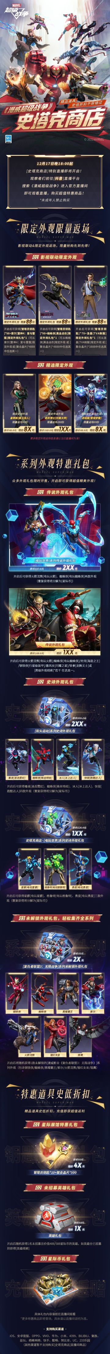 { "text": "#漫威超级战争#☆史塔克商店 | 特别直播☆ \n[史塔克商店]特别直播正式定档,最新情报速速奉上↓↓↓\n\n※直播时间\n12月17日晚18:00-20:00\n\n※观看指引\n前往[抖音]直播平台,搜索《漫威超级战争》进入官方直播间,或戳评论区传送门,即可观看直播!届时不仅有限定外观限量上架、精品道具史低折扣,更有策划空降直播间与大家见面互动,12月17日晚18:00,我们不见不散!\n\n※内容预告\n▷电影外观限量返场\n蜘蛛侠[黑金战衣]、洛基[TVA制服]、索尔[漫威影业《雷神4:爱与雷霆》]\n▷限定外观惊喜上架\n【2022新春系列】奇异博士[伏魔天师]、曼蒂斯[碧玉佳人]\n【冬日庆典系列】迷境魔[雪境梦魔]、快银[冰场银影]、格鲁特[寒霜雪松]\n▷系列外观特惠礼包\n【电玩世界系列】传说外观礼包、【街头运动系列】史诗外观礼包、【漫威影业《复仇者联盟3:无限战争》系列】未解锁外观礼包等等超值来袭!\n▷特惠道具史低折扣\n[星际展馆]特惠礼包、[光曜宝匣]特惠礼包、未招募英雄礼包、星际币礼包等道具史低折扣,限时特惠!\n\n更多惊喜内容敬请锁定《漫威超级战争》抖音官方直播间,届时将有更多福利不容错过!此外,网易游戏支付中心的福利也将持续开启,前往《漫威超级战争》专区即享iOS及安卓官服超值充值优惠,额外星际币返利惊喜不断!\n#漫威超级战争S6赛季# ", "raw_text": "" }