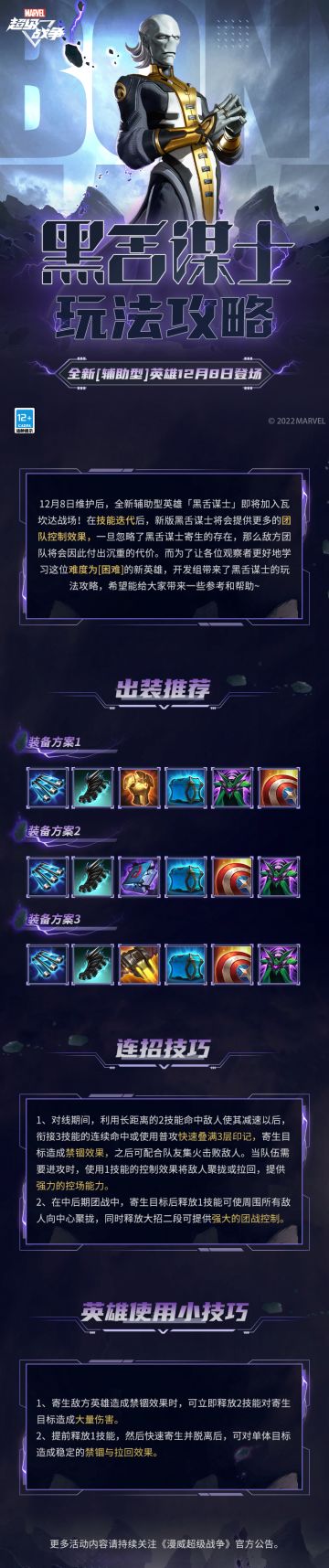 { "text": "#漫威超级战争#☆黑舌谋士玩法攻略☆\n12月8日维护后,全新辅助型英雄「黑舌谋士」即将加入瓦坎达战场!\n在技能迭代后,新版黑舌谋士将会提供更多的团队控制效果,一旦忽略了黑舌谋士寄生的存在,那么敌方团队将会因此付出沉重的代价。而为了让各位观察者更好地学习这位难度为[困难]的新英雄,开发组带来了黑舌谋士的玩法攻略,希望能给大家带来一些参考和帮助~\n\n更多活动内容请持续关注《漫威超级战争》官方公告。\n#漫威超级战争S6赛季##黑舌谋士# ", "raw_text": "" }