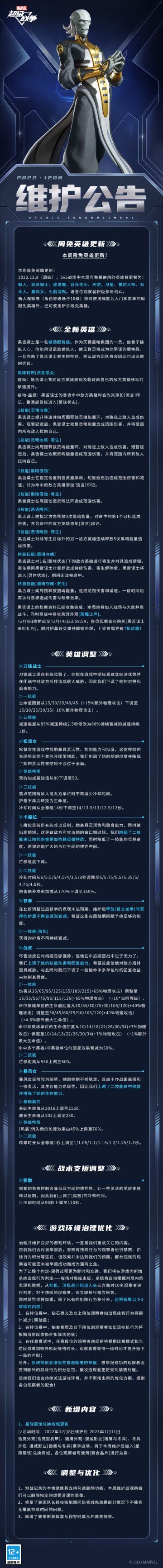 { "text": "#漫威超级战争##维护公告# \n观察者们下午好,本周的维护公告来啦!\n▷全新辅助型英雄「黑舌谋士」即将登陆瓦坎达战场!\n▷针对刀锋战士、松鼠女、卡魔拉、铁拳、战虎、暴风女进行平衡性调整。\n▷星际展馆兑换商城更新,限定外观【浩克·[复仇者机甲出击系列]浩克型机甲】【猎鹰·漫威影业《猎鹰与冬兵》】、【冬兵·漫威影业《猎鹰与冬兵》】携手返场!\n▷优化游戏环境治理,新增系统违规行为判定,加重违规惩罚。\n\n更多内容快跟薇薇安一起来看看吧~", "raw_text": "" }