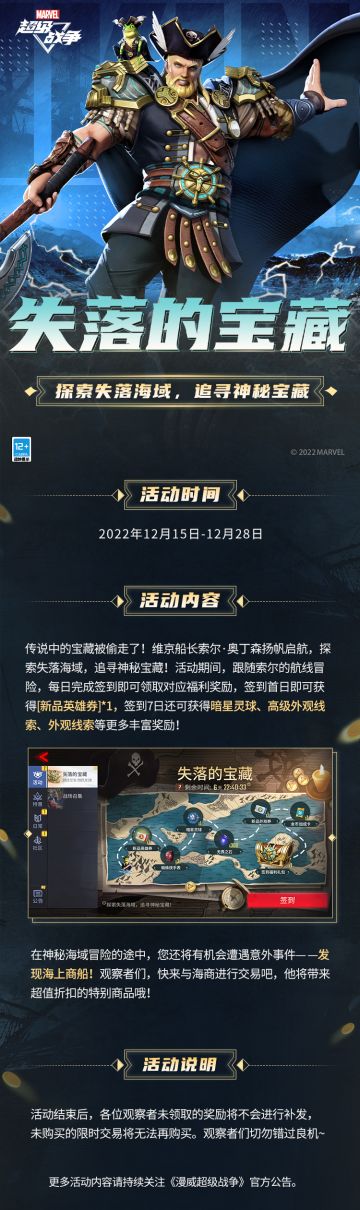 { "text": "#漫威超级战争#☆失落的宝藏☆\n传说中的宝藏被偷走了!!\n维京船长索尔·奥丁森扬帆启航,探索失落海域,追寻神秘宝藏!\n观察者们,快来跟随维京船长一起开启冒险吧!12月15日-28日,每日完成签到即可领取对应福利奖励,还将有机会遭遇意外事件——发现海上商船,解锁超值折扣的特别商品哦~\n\n更多活动内容请持续关注《漫威超级战争》官方公告。\n#漫威超级战争S6赛季#", "raw_text": "" }