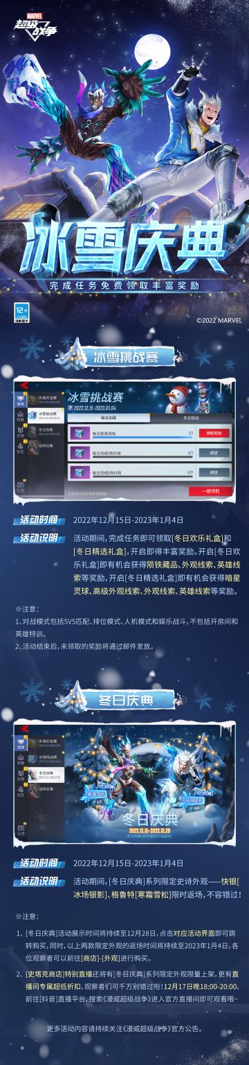 { "text": "#漫威超级战争#☆冬日庆典☆\n凛凛寒冬,银装素裹,今年的瓦坎达也将如约迎来冰雪庆典。\n颂歌响起,阵阵笑语传来。超级英雄们身穿礼服前来赴宴,观察者们,快来一起享受这场冰雪盛会吧!\n\n▷冰雪挑战赛\n活动期间,完成任务即可领取[冬日欢乐礼盒]和[冬日精选礼盒],开启即得暗星灵球、高级外观线索等丰富奖励!\n▷冬日庆典\n活动期间,[冬日庆典]系列限定史诗外观——快银[冰场银影]、格鲁特[寒霜雪松]限时返场!\n\n更多活动内容请持续关注《漫威超级战争》官方公告。", "raw_text": "" }
