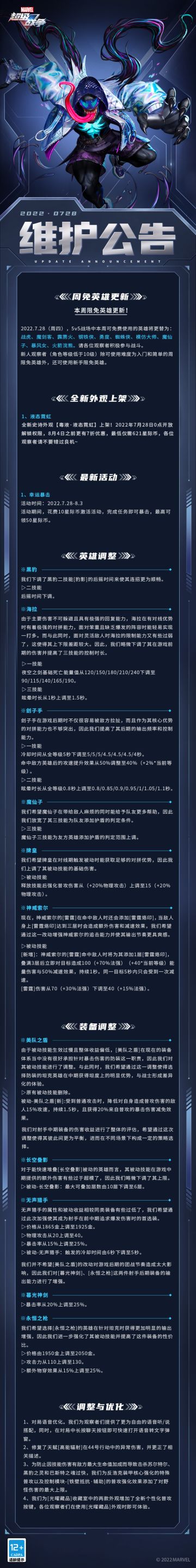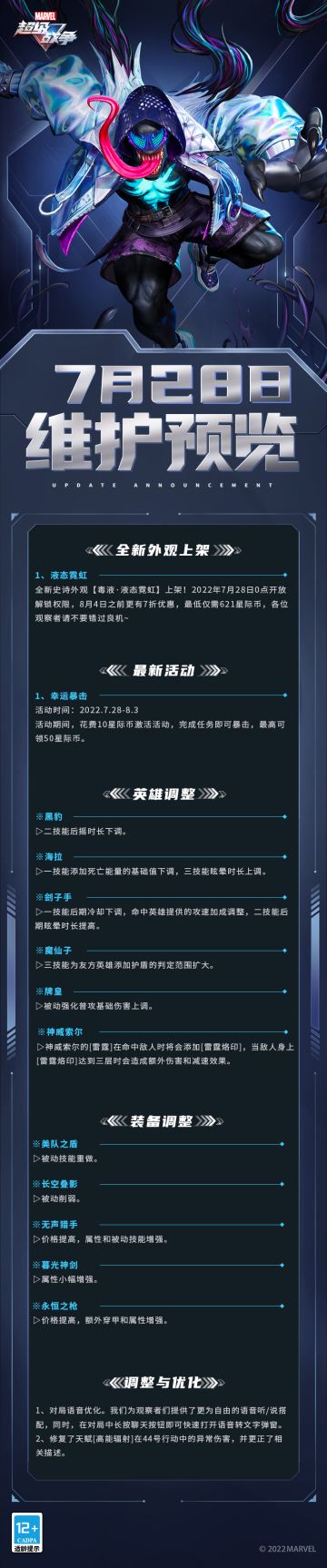 { "text": "观察者们下午好,本周的维护预览来啦~\n▷全新史诗外观【毒液·液态霓虹】将于7月28日零点上线!\n▷全新活动【幸运暴击】即将上线!\n▷针对黑豹、海拉、刽子手、魔仙子、牌皇和神威索尔进行了平衡性调整。\n▷针对对局语音进行了优化。\n更多内容快跟薇薇安一起来看看吧~", "raw_text": "" }