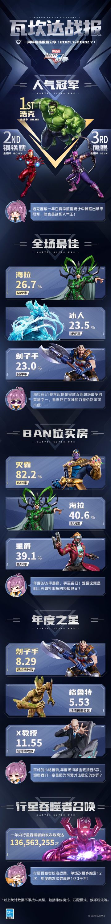 { "text": "漫威宇宙浩瀚无垠,超级英雄各有传奇。\n面对行星吞噬者的入侵以及更多未知危机,瓦坎达战场现已陆续集结了近80位超级英雄,相信观察者们也留下了不少珍贵的游戏记忆。\n而伴随着一周年庆典暨S5赛季的到来,薇薇安特别盘点2021.7-2022.7期间各位观察者与超级英雄们并肩作战的出色表现!欢迎大家在评论区热情分享您的战斗体验与作战技巧哦!\n\n更多周年庆内容请持续关注《漫威超级战争》游戏内公告及官方账号动态。", "raw_text": "" }