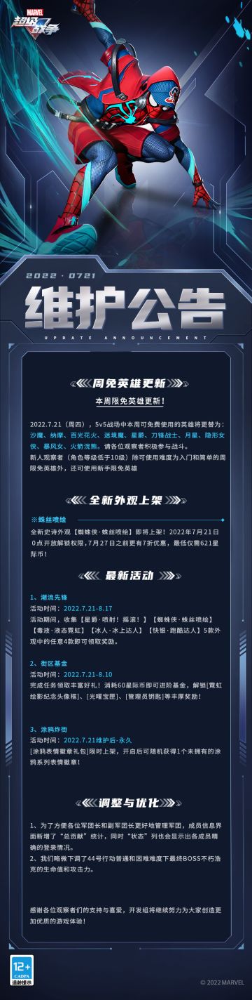 { "text": "观察者们下午好,本周的维护公告来啦~\n▷全新史诗外观【蜘蛛侠·蛛丝喷绘】将于7月21日零点上线!\n▷【潮流先锋】【街区基金】等全新活动即将上线,丰富好礼等你来领!\n更多内容快跟薇薇安一起来看看吧~", "raw_text": "" }
