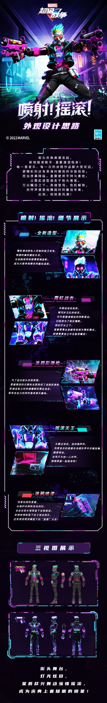 { "text": "☆喷射!摇滚!设计思路☆\n街头庆典高潮迭起,新锐摇滚歌手·星爵潇洒现身!\n每一首音乐、每一次的涂鸦作品都大受欢迎,\n更精彩的还有表演时展现的华丽视效。\n而当夜幕降临,星爵便将手持元素枪,\n以霓虹造型游走于街头巷尾。\n万众瞩目之下,英雄登场,危机解除,\n欢呼声便是他舞蹈时的最佳伴奏,\n此刻,他就是风潮!", "raw_text": "" }