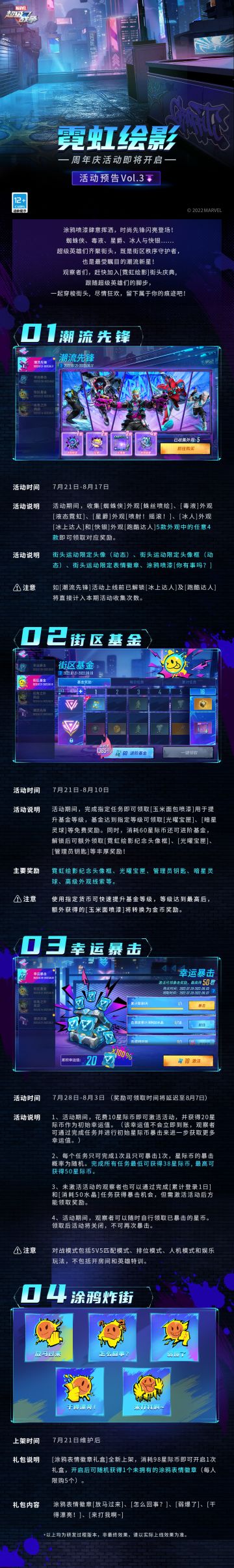 { "text": "涂鸦喷漆肆意挥洒,时尚先锋闪亮登场!\n蜘蛛侠、毒液、星爵、冰人与快银……超级英雄们齐聚街头,既是街区秩序守护者,也是最受瞩目的潮流新星!观察者们,赶快加入[霓虹绘影]街头庆典,跟随超级英雄们的脚步,一起穿梭街头,尽情狂欢,留下属于你的痕迹吧!\n\n更多周年庆内容请持续关注《漫威超级战争》游戏内公告及官方账号动态。", "raw_text": "" }