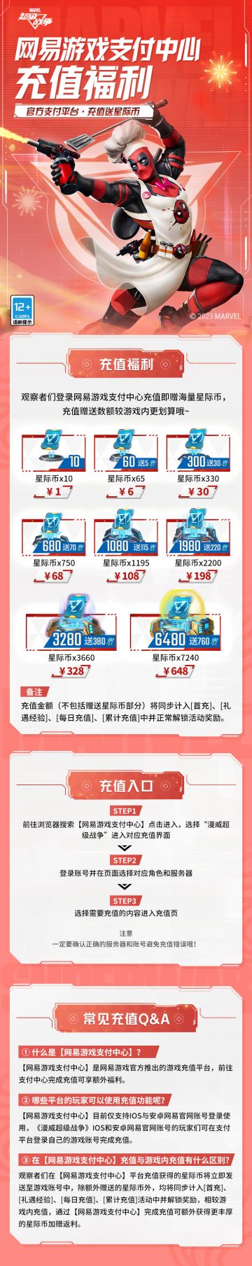 { "text": "☆充值有礼!网易游戏支付中心福利☆\n——充值加赠额外星际币返利!\n\n▷充值福利\n网易游戏支付中心充值福利来袭!前往网易游戏支付中心,充值任意星际币档位即可享受额外星际币加赠返利,充值赠送数额较游戏内更划算哦~\n\n▷特别注意\n1、[网易游戏支付中心]为官方支付渠道,目前仅支持iOS与安卓网易官网账户登录使用。\n2、观察者们在[网易游戏支付中心]的充值金额(不包括赠送星际币部分)将同步计入[首充]、[礼遇经验]、[每日充值]、[累计充值]并解锁活动奖励!\n\n更多详细信息,可戳下方长图查看↓↓↓\n#漫威超级战争##漫威超级战争S7赛季#", "raw_text": "" }