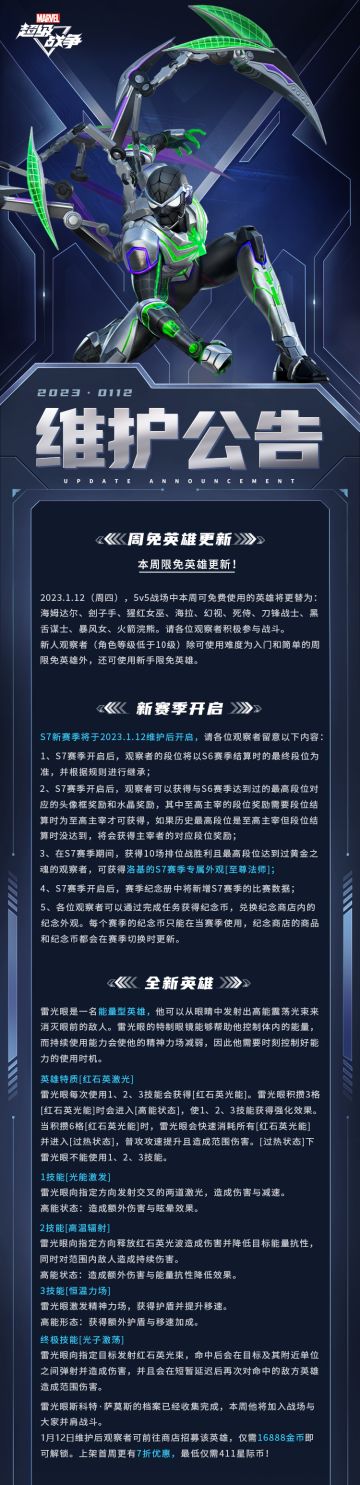 { "text": "#漫威超级战争S7赛季##维护公告#\n超英贺新岁,共赴不夜城!全新S7新春版本即将惊喜开启,我们计划将于1月12日04:00-09:00期间进行版本更新停机维护。维护期间将无法进行匹配与排位,为确保您的游戏体验,请于维护前提前结束对战。本次维护给各位观察者带来的不便,敬请谅解!\n\n※维护内容\n▷欢迎来到新岁夜城!2023新春限定系列活动马上开启,海量福利等你来领!\n▷X战警领袖登场!全新能量型英雄「雷光眼」即将登陆瓦坎达战场!\n▷虚拟空间,漫游时空!蜘蛛侠全新宇宙至高外观[时空漫游]震撼来袭!\n▷全域追踪,刀锋狩猎!刀锋战士全新史诗外观[银锋逐猎]等你解锁~\n▷战令系统全面升级!战令特供外观死侍[好菜!好菜啊!]即将上线!\n▷S7赛季正式开启!排位战获胜10场且最高段位达到黄金之魂,解锁赛季专属外观「洛基·至尊法师」!\n▷瓦坎达战场新增3款全新装备,并针对4款原有装备进行调整迭代。\n▷新增对局重开功能,并针对克隆装置、野区环境、上分难度等多项内容进行了调整。\n▷针对幻视、钢铁侠、冰月花雪、绿魔、美国队长、灵蝶、刀锋战士、死侍等英雄进行了平衡性调整。\n▷更多丰富内容快戳大图了解吧~\n\n※本次维护不排除延迟开启的可能,如若延迟请关注《漫威超级战争》官方公告。", "raw_text": "" }